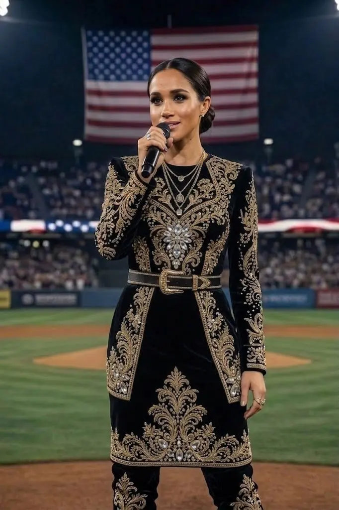 It was as if time itself had slowed down, forcing every individual in the building to become fully present in a moment that felt less like a celebrity appearance and more like a sacred tribute.What made the performance so arresting was not a display of vocal gymnastics or the pursuit of technical perfection. In a world where national anthems are often used as platforms for singers to showcase their range through dramatic riffs and soaring high notes, Meghan chose a path of profound restraint. Her voice carried a raw sincerity that felt deeply human and intentionally unpolished.
